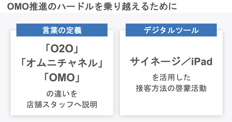 ここから先が最大のポイントになります。言わずもがなどんなにアイデアとして素晴らしくても、結局は現場がついてこれないとOMO施策は全く進みません。現場の担当者にデジタルの知識がなく、急にデジタル化、OMOというと拒絶反応が出るのは普通のことです。そういう難しい環境の中で、関氏は2つのポイントで現場に寄り添い推進していきました。