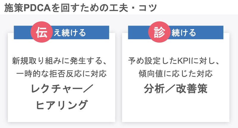 店舗スタッフにレクチャーとヒアリングをし、分かるようになるまで丁寧に繰り返し教えつつ、実際にやってもらったことを「見る」、すなわち放置せずに健康診断を定期的に繰り返したといいます。