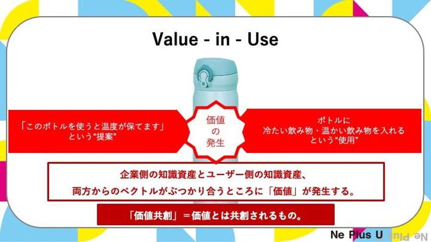 「グッズ・ドミナント・ロジック」が「交換価値」なのに対し、「サービス・ドミナント・ロジック」では「使用価値 Value-in-Use」や「文脈価値 Value-in-Context」という見方がなされます。