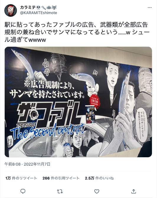 その究極の例とでも言えそうなのが、11月に大阪の地下鉄駅などに掲載された漫画『ザ・ファブル』の駅張りポスターです。ここでの制約は、各鉄道会社が設けている駅張りポスターに対する広告規制。その細かな規定は会社によって異なるようですが、銃などの凶器を登場させることは禁じられていることが多いようです。しかし、『ザ・ファブル』は殺し屋達の壮絶な戦いが描かれている漫画。銃を登場させずして、その魅力は伝えられません。さて、どうするか?