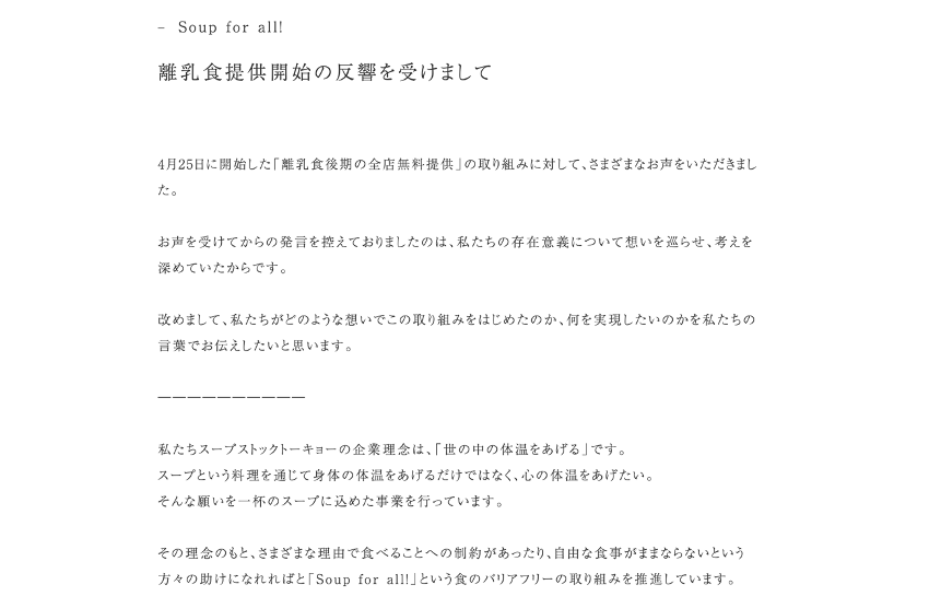 4月26日には声明文を発表し、これまで「Soup for all!」という食のバリアフリーの取り組みを推進してきたことなど、詳細な説明を行った。そして、その「炎上」に対する毅然とした対応が絶賛された。今回の対応は、他の企業にとっても参考になるであろう。