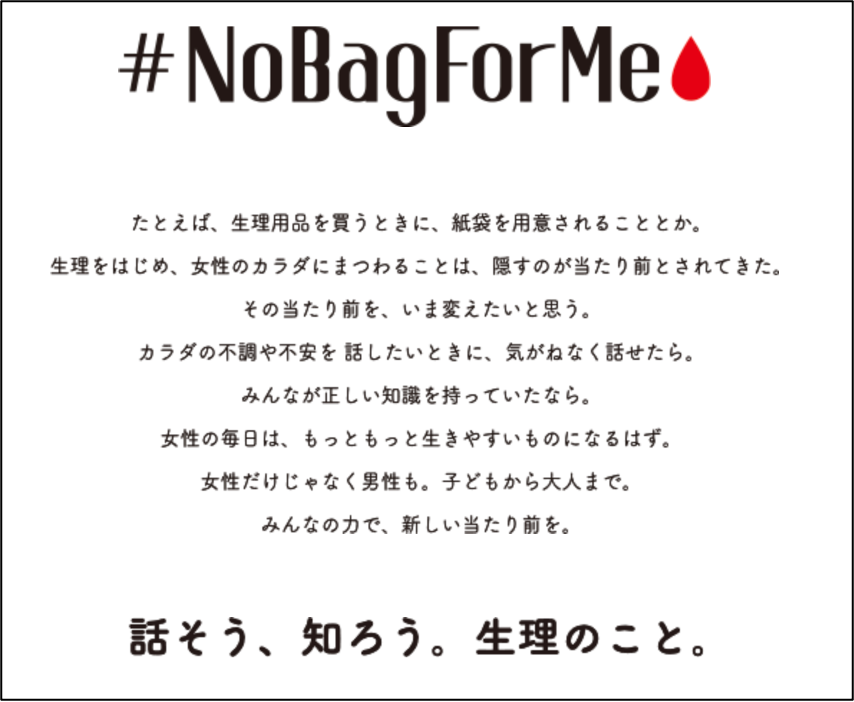 「#NoBagForMe」とは、生理用品を購入するときの抵抗感をなくすことを目指すプロジェクトで、「No Bag For Me=私にバッグはいりません」という意味です。生理用品が隠れた商品であったときは、店のスタッフさんが生理用品のパッケージが見えないように店頭で紙袋(Bag)に包んで渡してくれていました。その状況を変えよう、生理用品を前向きに捉えよう、生理を特別視しすぎず、できる限り通常に近い状態で過ごしましょうという想いから、この運動を始めたのです。このように変化する社会をリードしていくこともユニ・チャームの事業理念のひとつです。