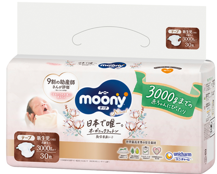 それから、日本で唯一オムツの表面シートにオーガニックコットンを使ったおむつ「ムーニーナチュラル 無漂白」は、肌に優しいという特徴以外に、もうひとつお母さんのために工夫をしています。それは、毎日大変な思いをしているお母さんのために、赤ちゃんがおしっこをするとおむつに「ありがとう」の文字が浮かぶ工夫をしています。使っていただいたお母様方から「赤ちゃんが私に感謝してくれているようで嬉しい!」という声をいただいています。育児はかわいい赤ちゃんとの毎日が楽しい一方で大変なことも多く、ママ・パパは育児のご苦労を感謝される機会も少ない中「育児を応援しよう」というユニ・チャームの事業理念に則って生まれた商品です。