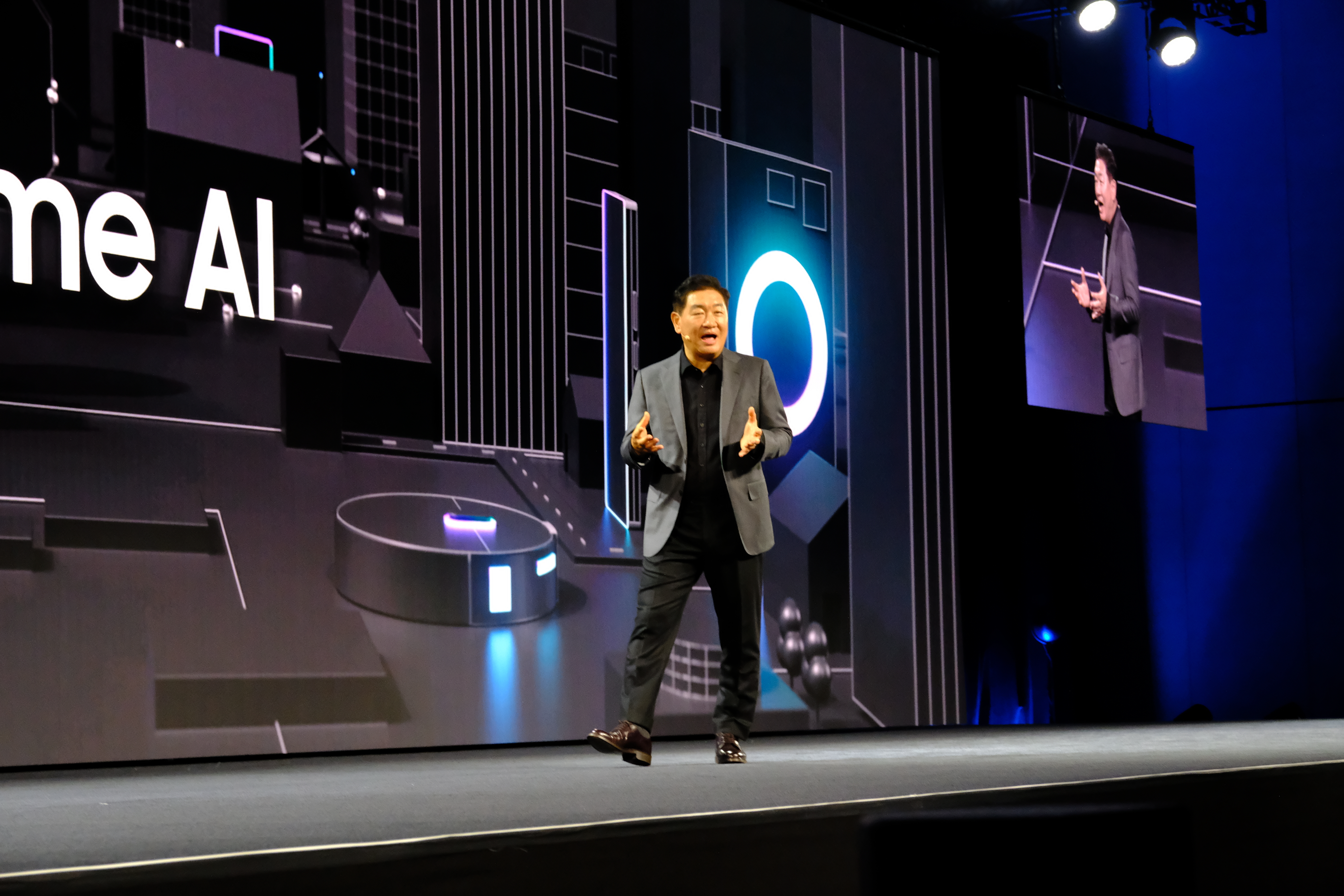 SAMSUNGのプレゼンでは冒頭、CEO兼 DX(Device eXperience)部門長のJH Han氏が登壇しました。同氏は「SAMSUNGは10年間、ホームイノベーションをリードし、デバイス間の連携を深化させてきました。今後10年間でAIを中心に据えた革新を続け、次の世紀に向けた土台を築きます」と、次の10年はAIを軸に推進することを宣言しました。