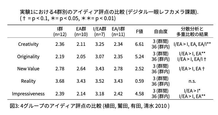 I/EA群(イノベーターからの情報を受けてアーリーアダプターがアイデアを創出する)と、EA/I群(アーリーアダプターからの情報を受けてイノベーターがアイデアを創出する)の間に違いが見られることから、単に他者としての存在が認識されることで、創造的な思考が促進されるだけでなく、他者からのアドバイスの内容が影響を与えている可能性があることが示唆されます。