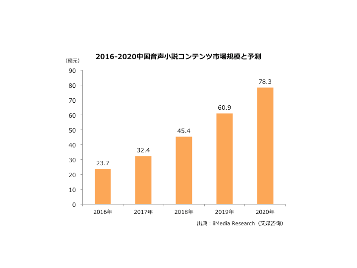 この数年で、これらの音声コンテンツを提供しているスマートフォンアプリの種類が急速に増え、それに伴うアプリをダウンロードするユーザー数は4.25億人(2018年、前年比22.1%伸び)となり、2019年には4.86億人に達する見込みと報道されています。