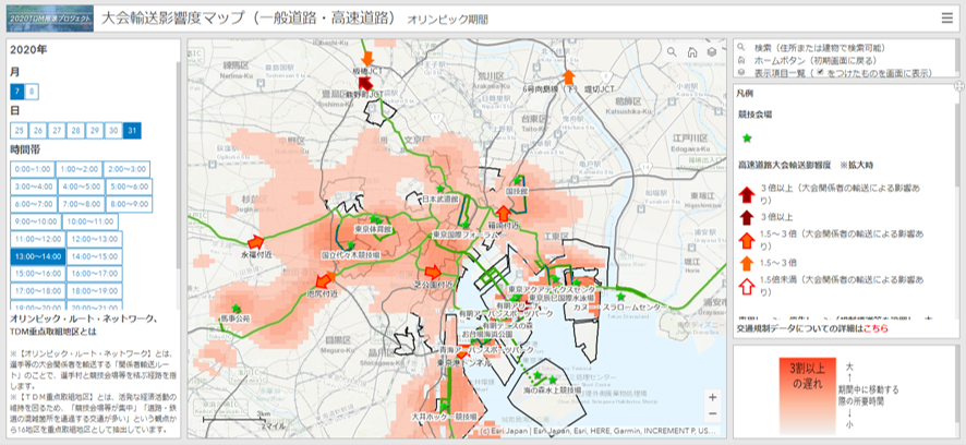 このマップは大会開催期間中の日別・時間帯別の交通量の変化を予測している。まずは新国立競技場で陸上競技がスタートする2020年7月31日13:00~14:00の道路状況を見てみよう。すると、高速道路のみならず一般道でも通常の3倍近くの交通量に達する箇所が都内にひしめいていることが分かる。