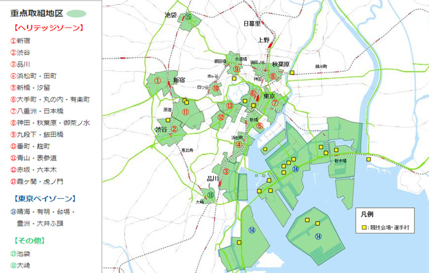 重点取組地区は大会競技場周辺のほか、交通集中が見込まれる16カ所のエリアが設定されている。商品が届かないどころか、オフィスでの業務にも影響がでそうな状況だ。オフィス周辺のコンビニエンスストアやレストランに商品や材料が届かなくなる可能性もあるだろう。