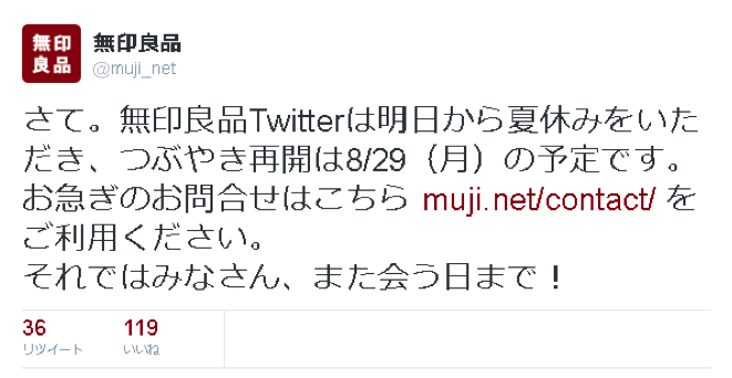 上記(4)についての補足でもあるが、安定したアカウント運用の継続には担当者の無理も禁物だ。若干極端な事例で恐縮だが、ひとり運用者だった筆者は、夏季休暇などでアカウント運用から離れる際は、下記のような投稿をしてアカウント運用の休止を伝えるようにしていた。