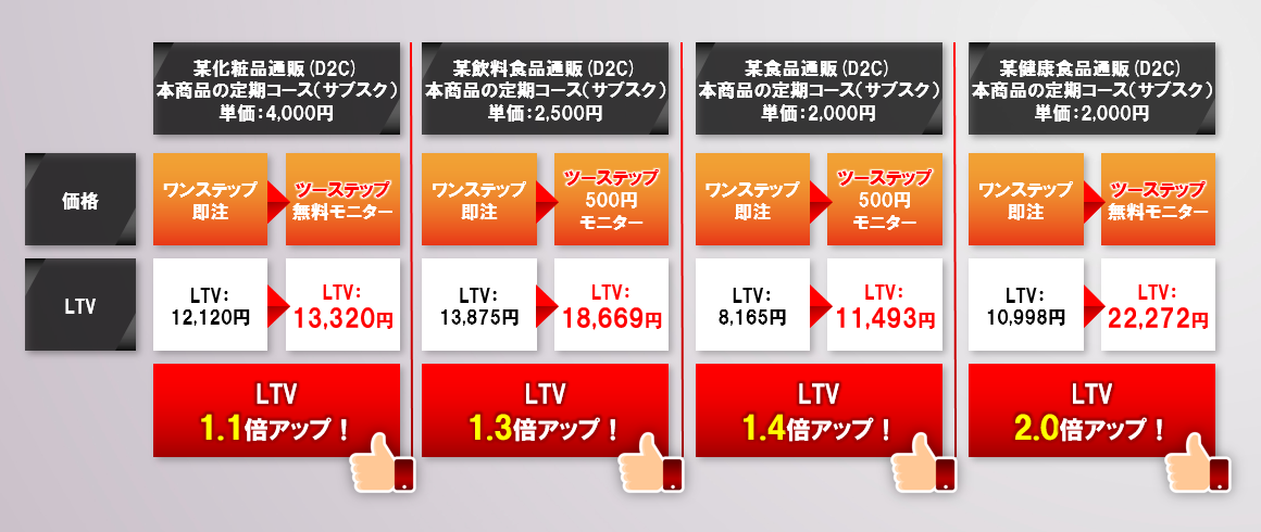 さらに、「ワンステップマーケティング」に比べ、「ツーステップマーケティング」はLTV(年間購入単価)も高い。売れるネット広告社のクライアントでは、「ワンステップマーケティング」に比べ「ツーステップマーケティング」ではLTVが1.1倍~2.0倍アップしている。