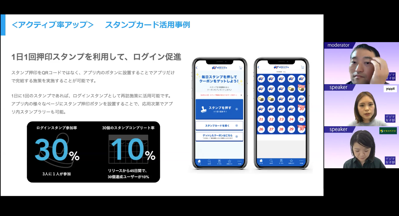 もう一方のスタンプカード機能は、条件に応じてユーザーにスタンプを付与するもので、アイデア次第で企画にさまざまな工夫ができる。タカラトミーでは、アプリへのログインで1日1個のスタンプがもらえる施策で再訪を促進。その結果、ログインスタンプの参加率は全体の30%と高く、45日間でスタンプ30個を達成した毎日ログインしたユーザーが10%いた。
