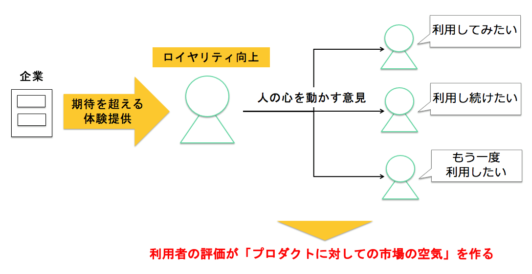 この循環によって、プロダクトに対しての良質な空気感が醸成できます。逆に言うと、お客さまの期待を裏切る行為をすると、一気に空気感が悪くなり、企業の信頼低下、売上も落ちるという流れになります。