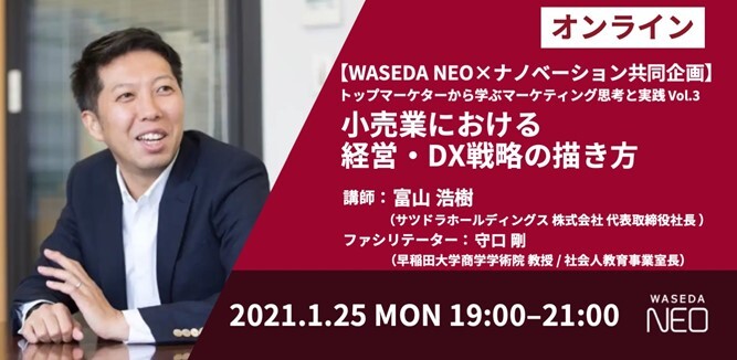 次世代を創造するリーダーたちの共創の場として早稲田大学が運営し、社会人向けのプログラムを提供している「WASEDA NEO」と、マーケティング領域のカンファレンスを行うナノベーションの共同企画であるオンライン講座「トップマーケターから学ぶ マーケティング思考と実践」の第3弾が1月25日に開催される。