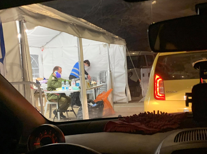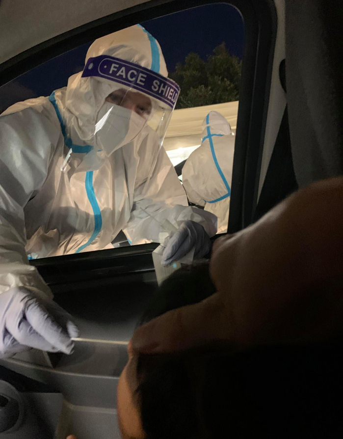 そうして向かったPCR検査所は、公園の駐車場に白いテントを立ててドライブスルー方式で検査を実施しており、たくさんの車が列を作っていました。まず入り口でQRコードを印刷したチラシを渡され、それにアクセスすると氏名・住所・電話番号・性別を記入するフォームに誘導されます。
