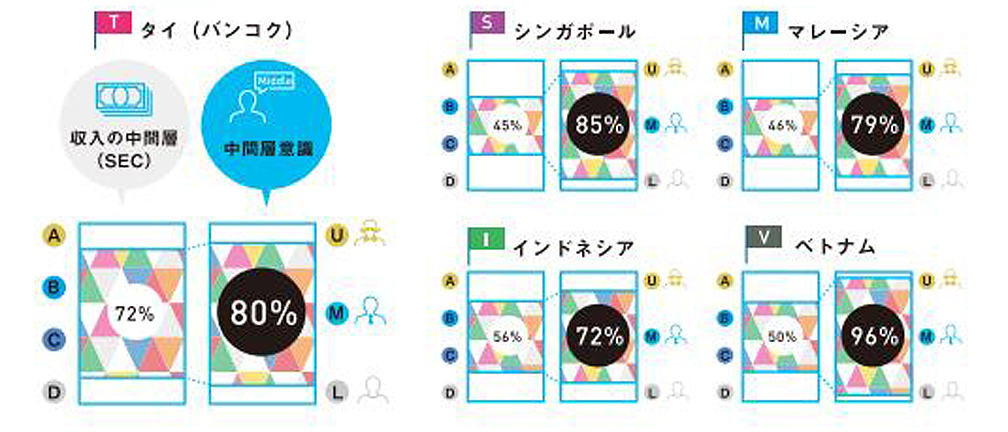 こちらは、博報堂生活総研アセアンがまとめた、収入で規定した中間層の比率と、自己意識(アンケート)で規定した中間層の比率を比較したものです。各国ごとの棒グラフで左側が収入で規定した中間層の比率です。