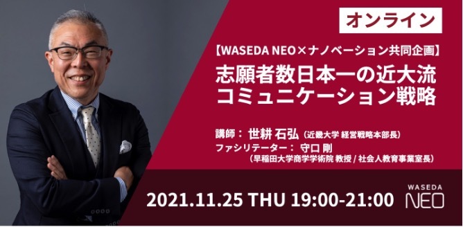早稲田大学が次世代を創造するリーダーたちの共創の場として社会人向けプログラムを提供している「WASEDA NEO」と、マーケティング領域のカンファレンスを行うナノベーションの共同企画であるオンライン講座「トップマーケターから学ぶ マーケティング思考と実践」の第7弾が11月25日に開催される。今回は、近畿大学で経営戦略本部長を務める世耕石弘氏が講師として登壇。少子高齢化や学生数減といった課題がある中、志願者数8年連続日本一を成し遂げた近畿大学の偉業を世耕氏に聞き、早稲田大学守口剛氏が切り込む。