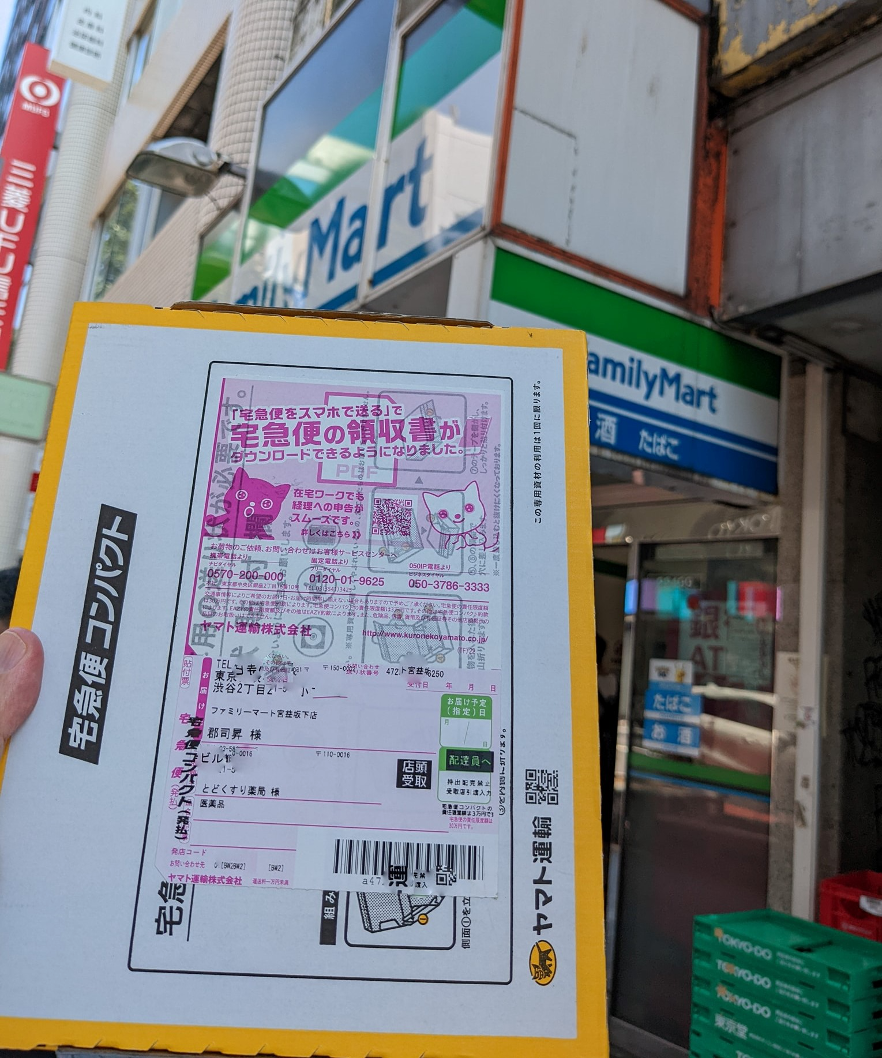 翌日(服薬指導7日後)の昼にヤマト運輸から宅配便コンパクトをファミリーマート宮益坂下店に納品したので受け取ってほしいという旨のメールが届きました。普通のコンビニ受取り同様に保管期間は翌々日までであり、保管期限の延長はできません。スケジュールを調整して、翌日受取りに行くこととしました。