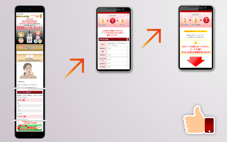 何がマズいかというと、アンケートに回答させた後、通常のランディングページ(広告専用ランディングページ)に遷移させてわざわざ画面遷移を増やしているのである。画面遷移を増やせば増やすほど、離脱が増え、コンバージョン率が低下するにもかかわらず…。
