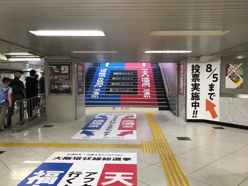 他にも大阪駅の階段で、「アフター5に行くならどっち? 福島派 天満派」という寄り道したい街を選んでもらう人気投票が実施されていました。福島派は青、天満派は赤のペイントが階段に描かれていて、その結果をセンサーで計測してモニターで表示するという企画です。遊び心があって階段の利用者が増えたという大阪人にとって、“おもろい”仕掛けです。