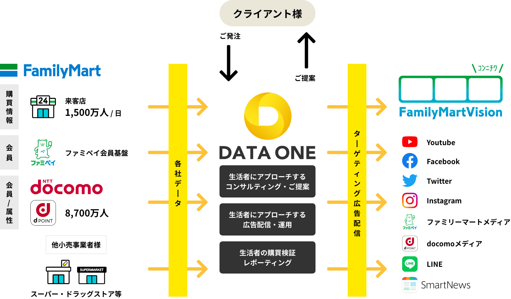 データ・ワンの広告サービスの特徴は、YouTubeや各SNS、Smart Newsなどのプラットフォームや、独自のDSP(広告配信システム)の接続先などに膨大なデータを活用した広告を出し分けることにより、一人ひとりの生活者にとって関連性の高い広告を表示することだ。