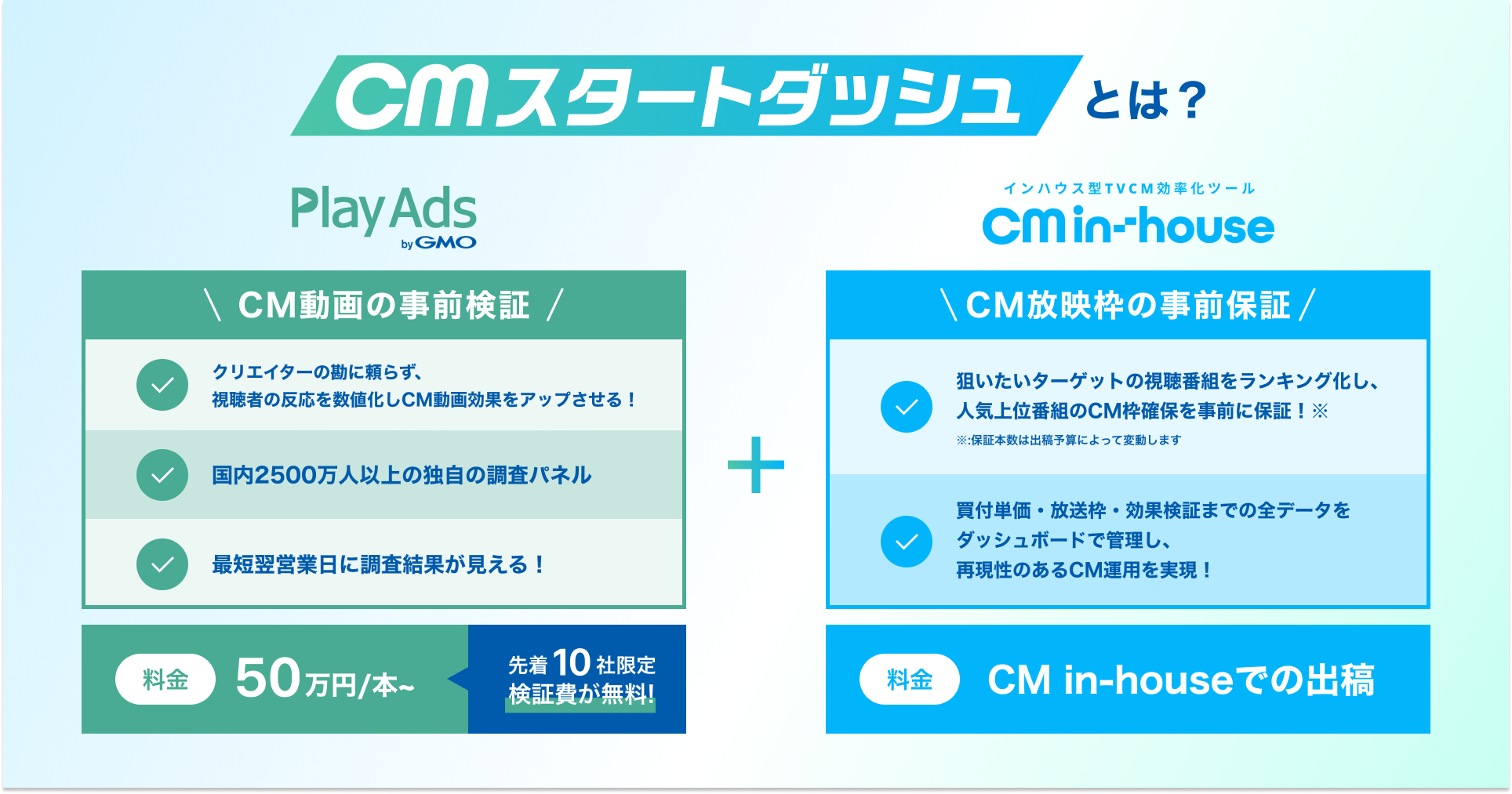 本日発表した、GMOプレイアドとの共同サービス『CMスタートダッシュ』もそのひとつです。テレビCMを成功させるには大きく2つの変数があり、それがクリエイティブと放映枠です。
