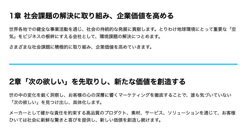 2002年に策定した前回の経営理念は第1章に「『次の欲しい』を先取りし、新たな価値を創造する」を掲げていました。次いで「第2章:世界をリードする技術で、社会に貢献する」、「第3章:企業価値を高め、新たな夢を実現する」、「第4章:地球規模で考え、行動する」と、全部で9章からなる理念でした。