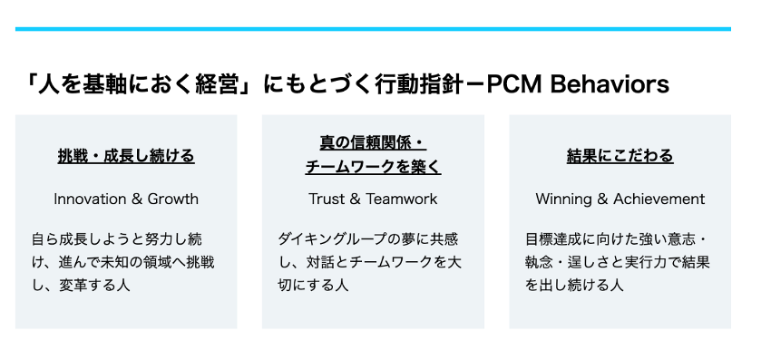 経営理念に加え、「人を基軸に置く経営(People-Centered Management:PCM)」にもとづく行動指針「PCM Behaviors」を新たに策定したことです。グループ従業員一人ひとりに求める指針で、「挑戦・成長し続ける」「真の信頼関係・チームワークを築く」「結果にこだわる」といったことを書いています。