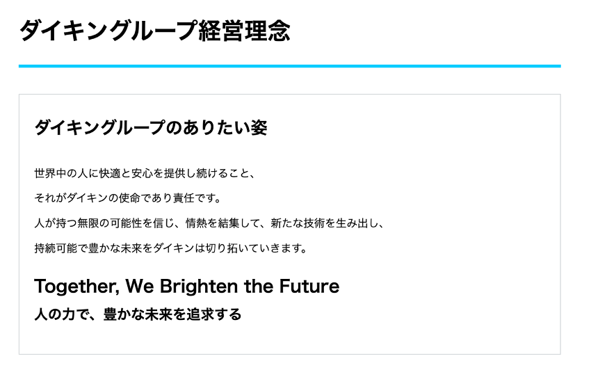 ダイキンは創業以来「人」の持つ無限の可能性を信じることでこれだけの成長を続けていますが、前回の理念ではしっかりと明文化できていませんでした。その後20年で、この「人」に関するダイキンの強みが「人を基軸におく経営」として体系化・言語化が進んだことから、理念の第6章 に「『人を基軸におく経営』を実践し、挑戦するチャンスにあふれ、社員が挑戦・成長し続けられる環境を提供する」として盛り込みました。
