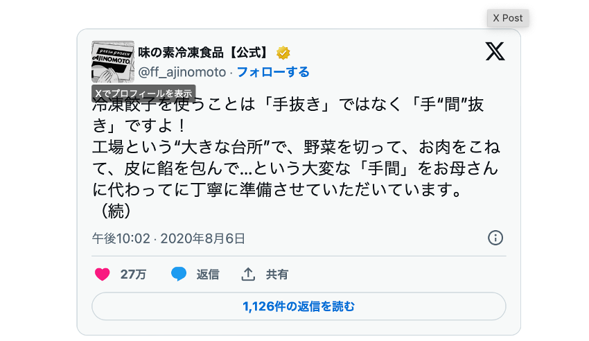 また、味の素冷凍食品のSNS担当者が過去にX上で冷凍食品を巡る手抜き論争が勃発していた際に、「手抜きではなく手間抜き」という投稿を通じて賛否の声が交差したものの、多くの応援の声を得ることができたという経験があったことも、好影響を与えていたようです。