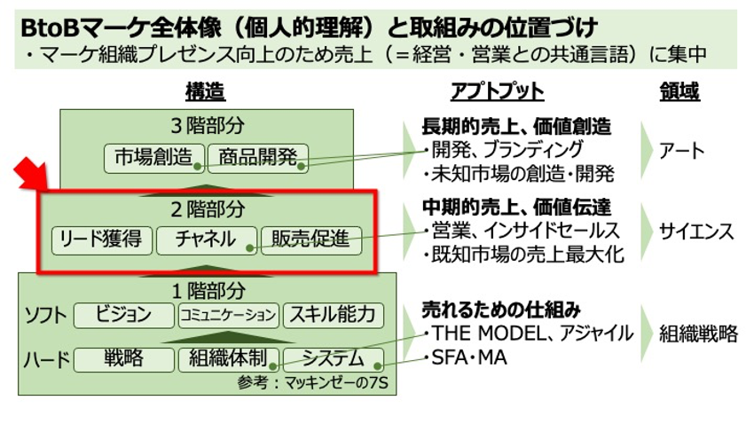 私個人の見解として、マーケティングの構造は3階層に分けられると考えています。1階層は仕組みづくりで、組織体制やシステムなどハードを整える活動と、コミュニケーションやスキルなどソフトを向上させる活動があります。真ん中にあたる2階層はお客様に価値を伝えていく活動で、リード獲得やチャネル、販売促進などいわゆるセールスマーケティングです。さらに3階層は長期的な価値を創るところで、商品開発や市場創造が位置づけられると考えています。