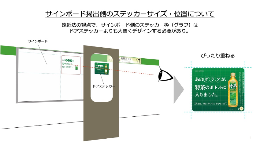 2024年の10月から11月にかけて、サントリー伊右衛門特茶が「ぴったり広告」と称して、このタイプの電車広告を展開しました。電車のドアの透明部分に貼られた広告には、「あの○○○が、特茶のボトルに入りました」の文字と、一部が空白になっているボトルが描かれています。さらに「(あの駅に着いたらわかるはず)」という文章も。