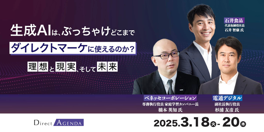 スピーカーとして、ベネッセコーポレーション 専務執行役員 家庭学習カンパニー長の橋本英知氏、石井食品 代表取締役社長の石井智康氏が登壇し、電通デジタル 副社長執行役員 兼 dentsu Japan CXプレジデントの杉浦友彦氏がモデレーターを務める。ベネッセコーポレーションは、生成AIを自社のプロダクトにいち早く導入し、教育現場に提供している。また、石井食品の石井智康氏は元ITエンジニアの経験を生かし、AI技術を活用して老舗企業の変革と新たな挑戦に取り組んでいる。AI時代におけるダイレクトマーケティングで成果を生むためのヒントが詰まった特別なセッションとなる。