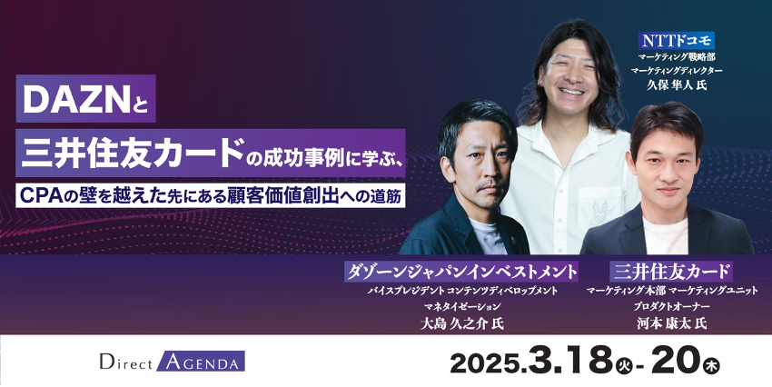 今回スピーカーとして、三井住友カード マーケティング本部 マーケティングユニット/プロダクトオーナーの河本康太氏、ダゾーンジャパンインベストメント バイスプレジデント コンテンツディベロップメント & マネタイゼーションの大島久之介氏が登壇し、NTTドコモ マーケティング戦略部/マーケティングディレクターの久保隼人氏がモデレーターを務める。