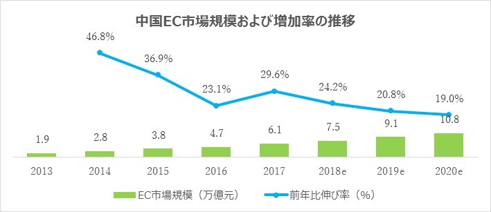 ◆中国EC市場規模及び増加率の推移(2013~2020)