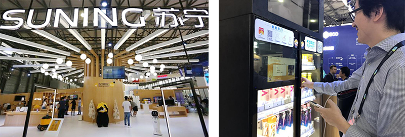 SUNING(蘇寧電器)の展示ブースでは、ショーケースや棚から商品を取り出す瞬間に品物が計上され、自動会計によってレジを通さずにそのまま商品を持ち帰ることが可能なシステムが展示されていました。