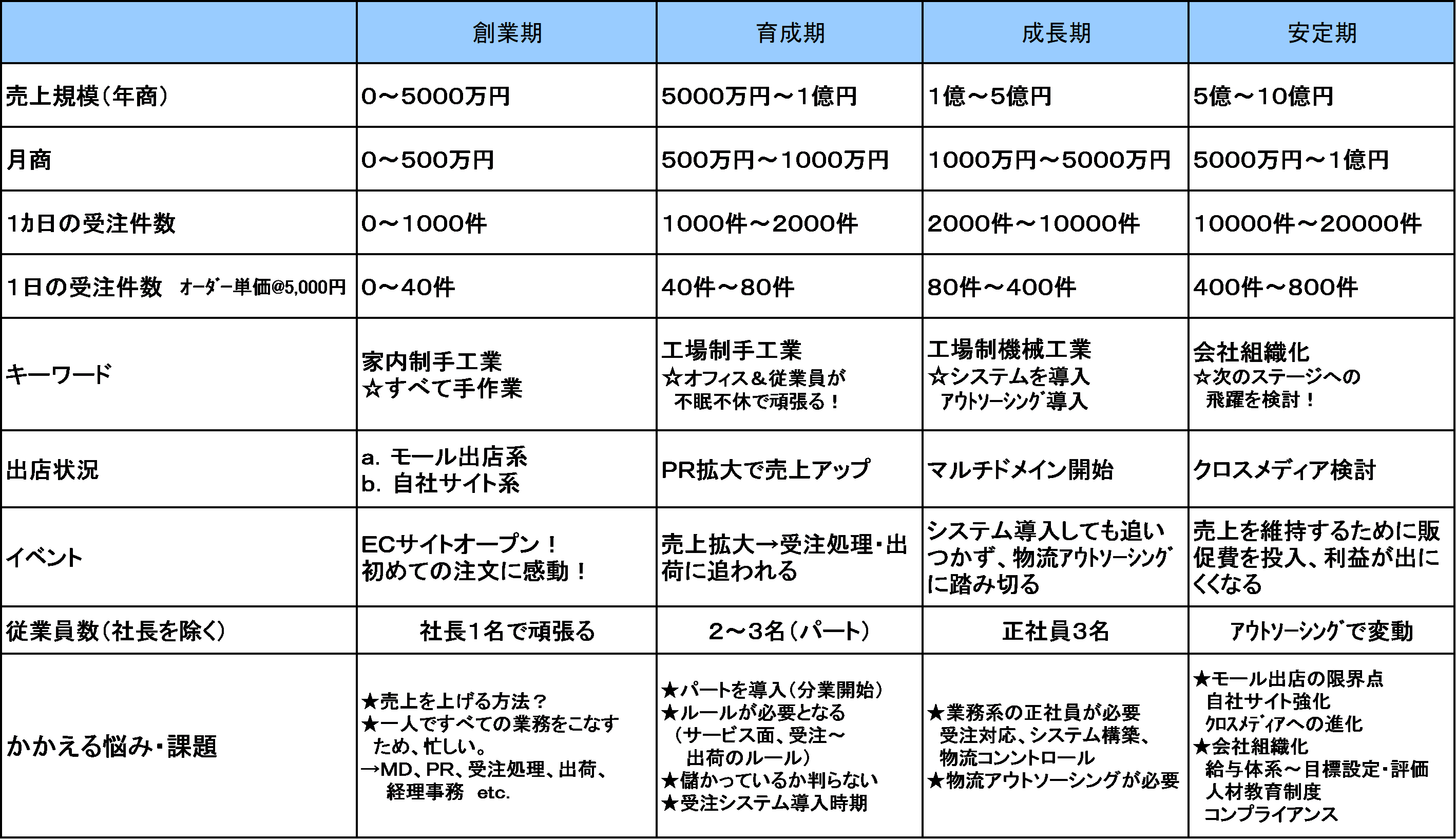 ネットショップの発展段階別の課題をまとめたものが次の表となる。