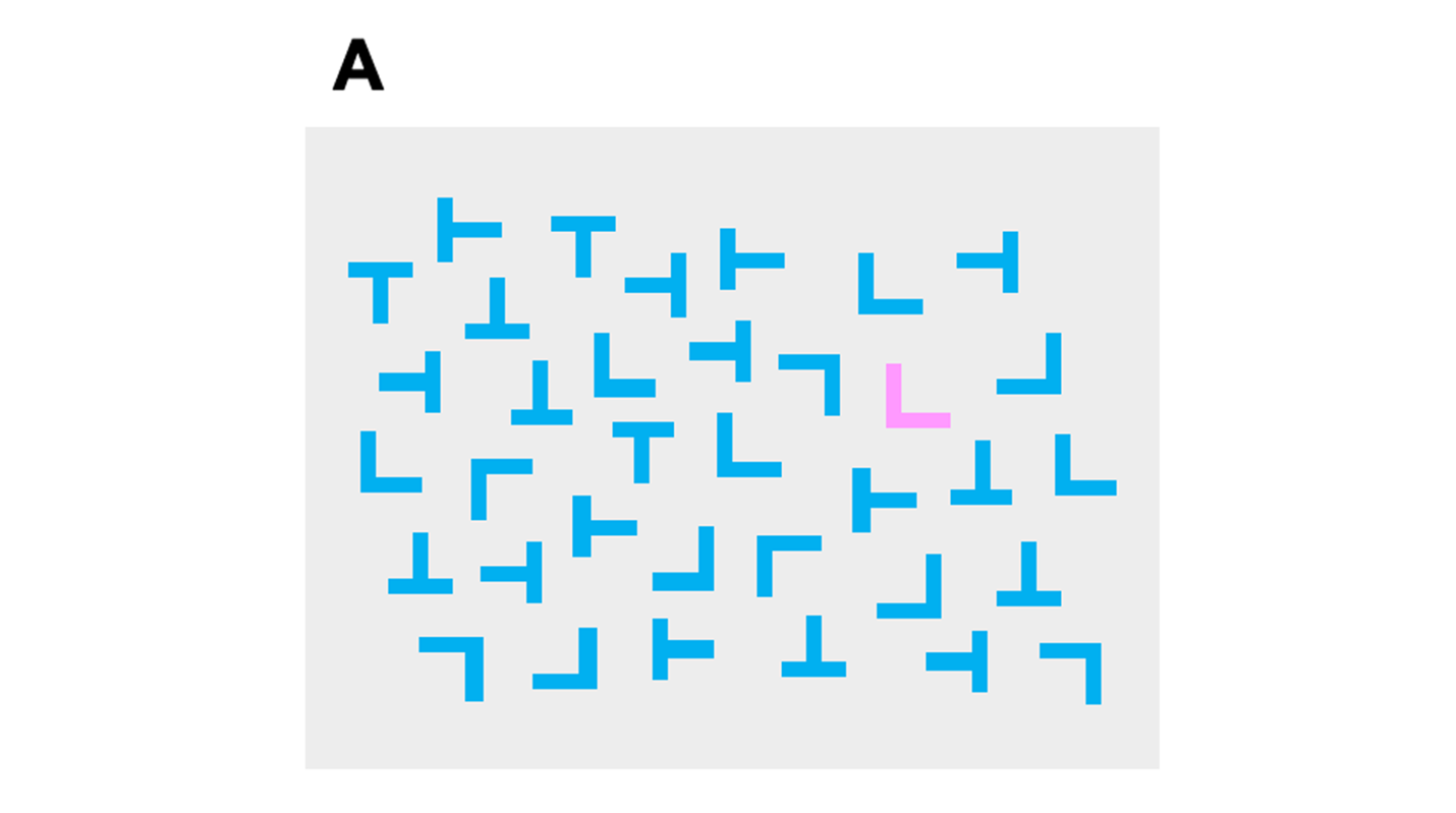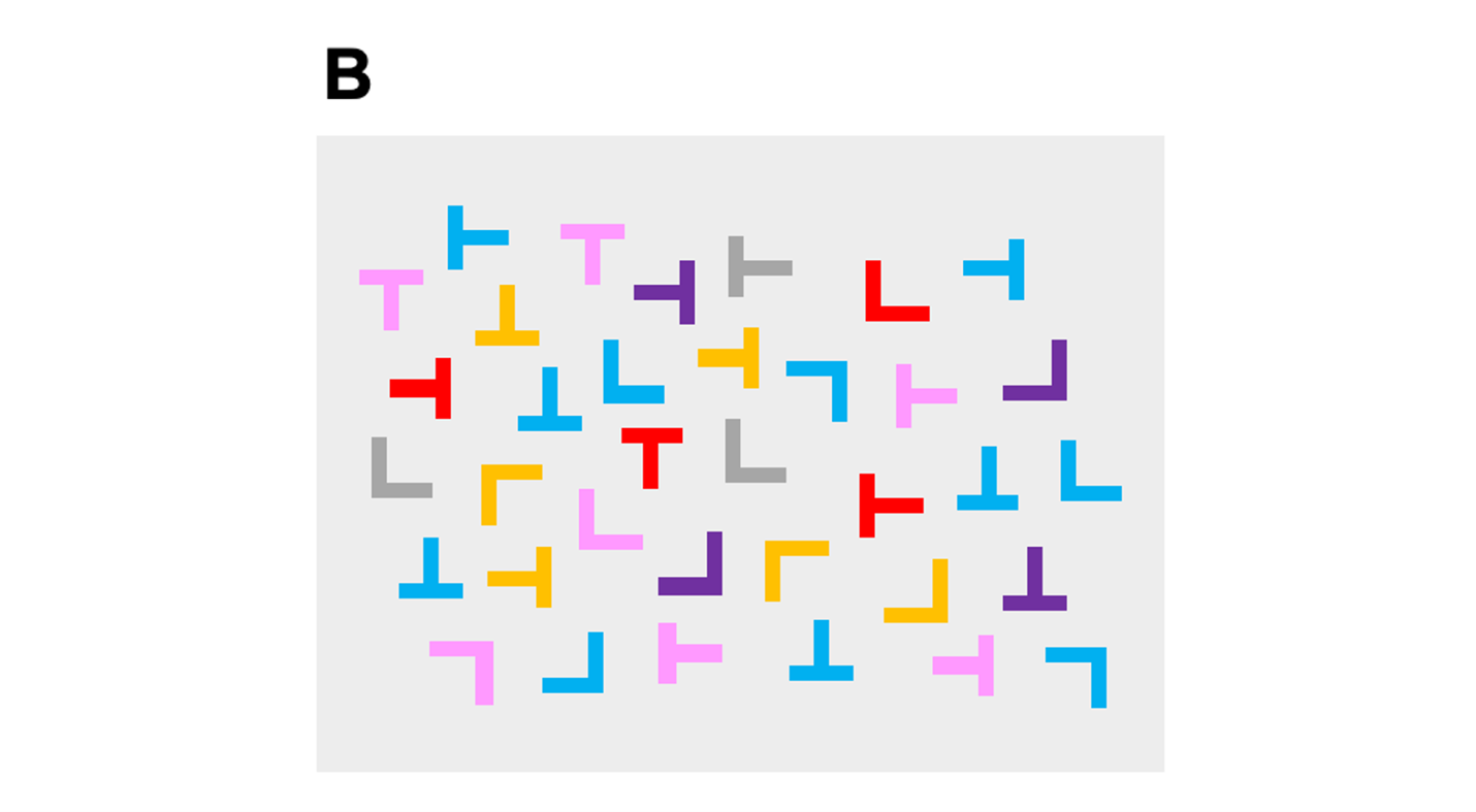 一方、BのほうでピンクのLを探そうとすると、色や形を組み合わせて、能動的に探索しないと見つけられません。これがトップダウン型の注意です。