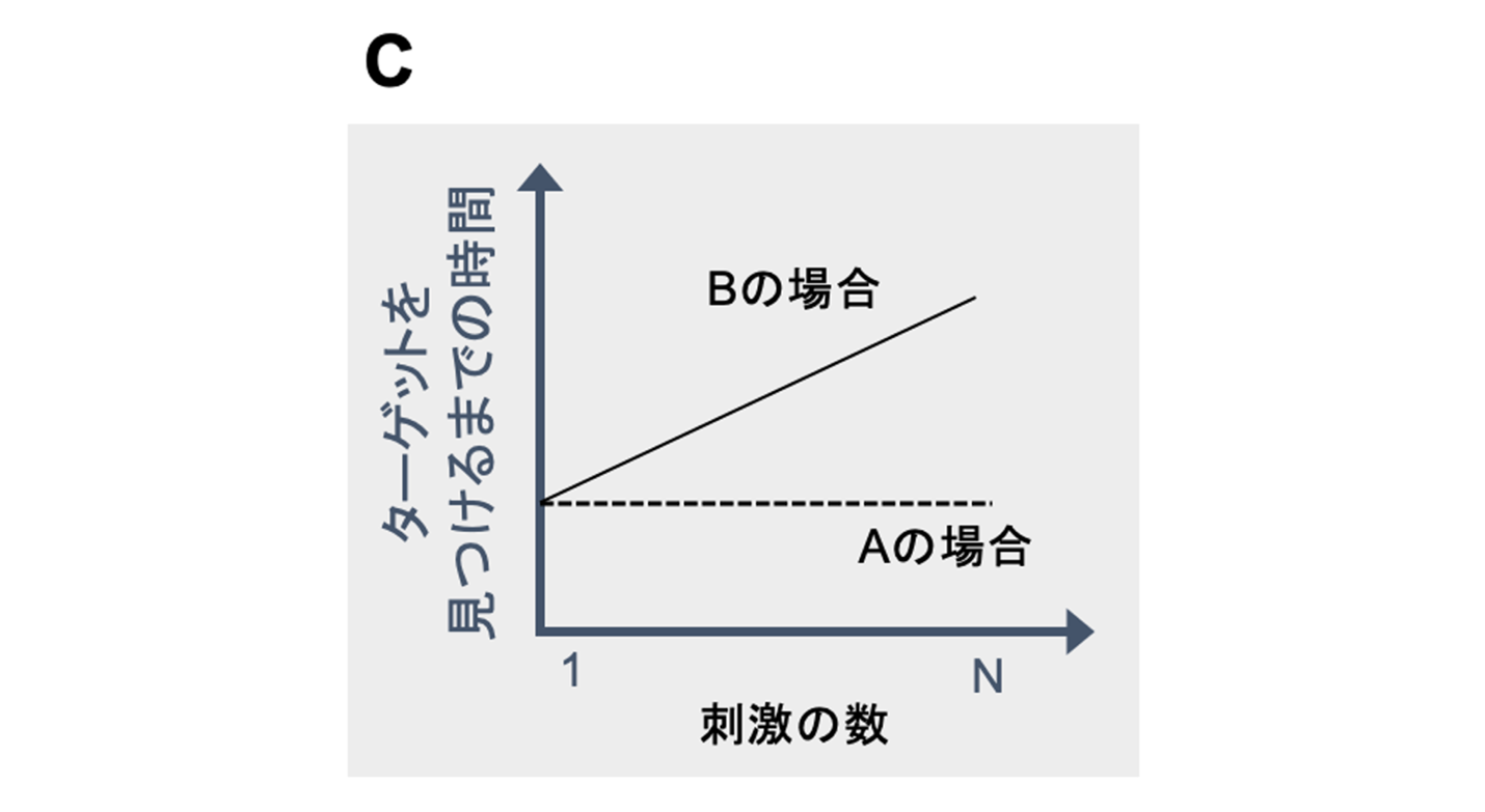 次のCのグラフにあるように、ボトムアップ型は、全体の刺激の数が増えても見つけるまでの時間は変わらず、あっという間に見つかります。