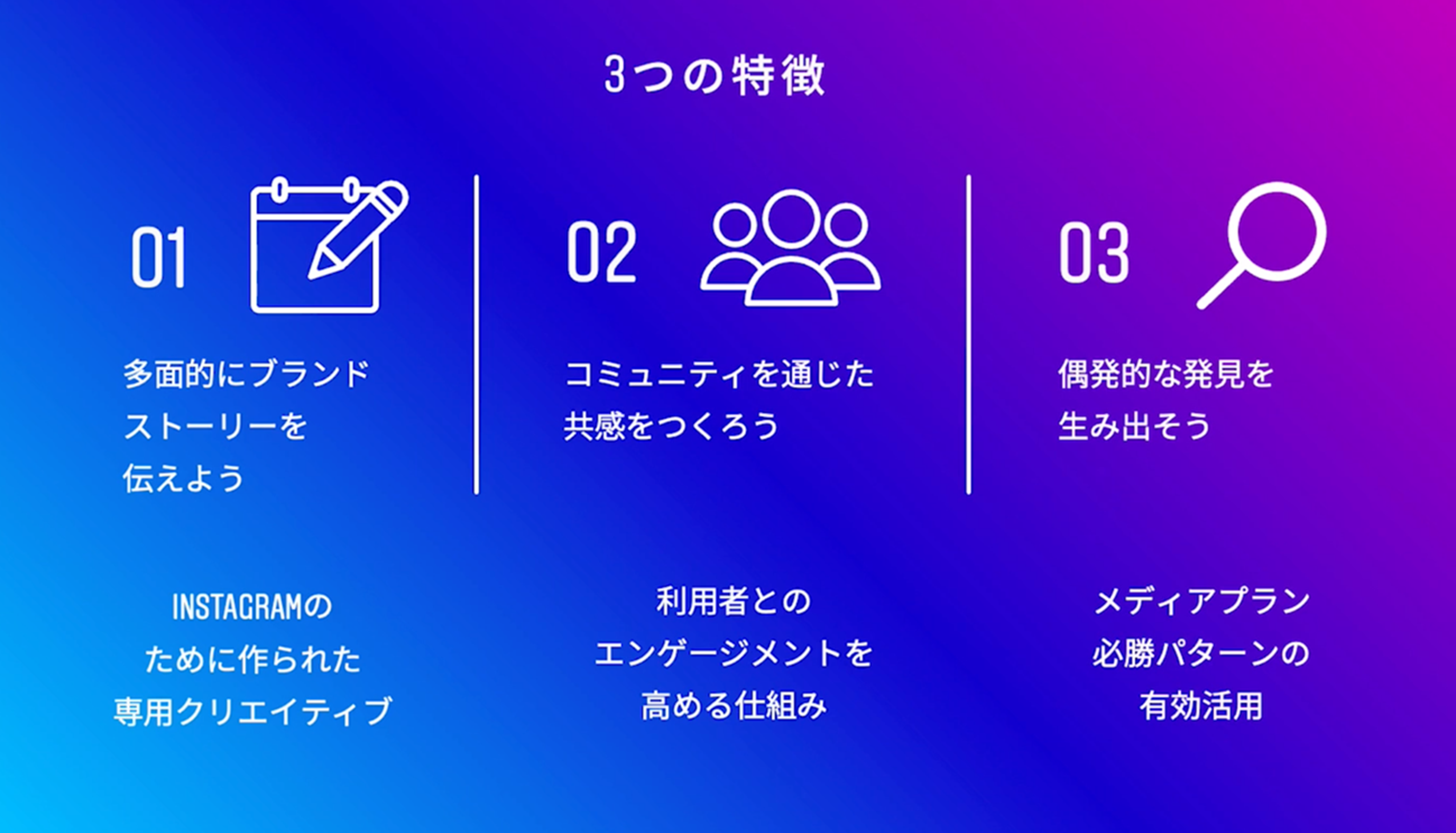 「成功した広告キャンペーンには3つの特徴があります。まず、Instagram専用のクリエイティブを活用し、多面的にブランドのストーリーを伝えていること。2つ目は、利用者とのエンゲージメントを高める仕組みでコミュニティを通じた共感をつくり上げたこと。3つめは、当社でまとめたメディアプラン必勝パターンを有効活用し、偶発的な発見を最大限に生み出したこと。この3つを巧みにキャンペーンに織り込んでいくことで、好きと欲しいをつくるキャンペーンが実現できます」(南氏)。