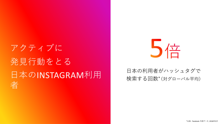 Instagramの月間アクティブアカウントは、世界では10億を抱え、日本では2019年時点で3300万以上と、幅広い利用者の生活に密着したプラットフォームに成長している。その理由のひとつを南氏は、「憧れの世界を描いた投稿だけでなく、実際に日々の生活に役立つ情報や試してみたくなる動画など、コンテンツの多様化が進んでいる点にあります」と話す。さらに、「日本ではハッシュタグを利用して能動的に情報を探し求める傾向が強く表れています。日本の利用者がハッシュタグを検索する回数は、グローバル平均の5倍にもなっています」と分析した。