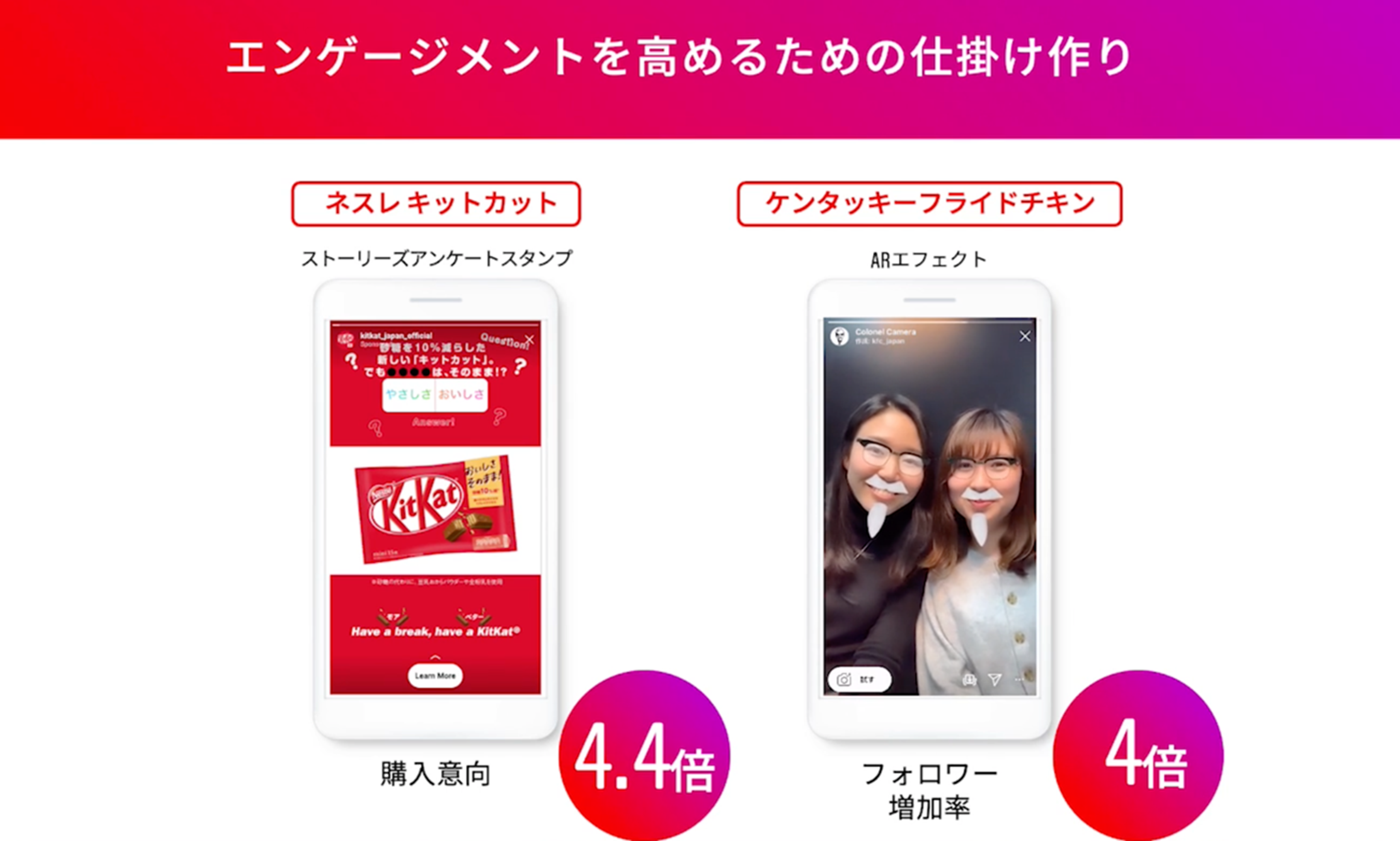 ステップ3では、広告キャンペーンの運用期間中に利用者とのエンゲージメントを高め、継続的にコミュニティの熱量を高める施策について触れ、「ネスレ日本のキットカットのキャンペーンでは、ストーリーズのアンケートスタンプを採用し、キャンペーンのメインメッセージをアンケートの質問に設定しました。その結果、メッセージの想起率が業界平均値の5倍、購入意向も4.4倍になりました」と説明した。