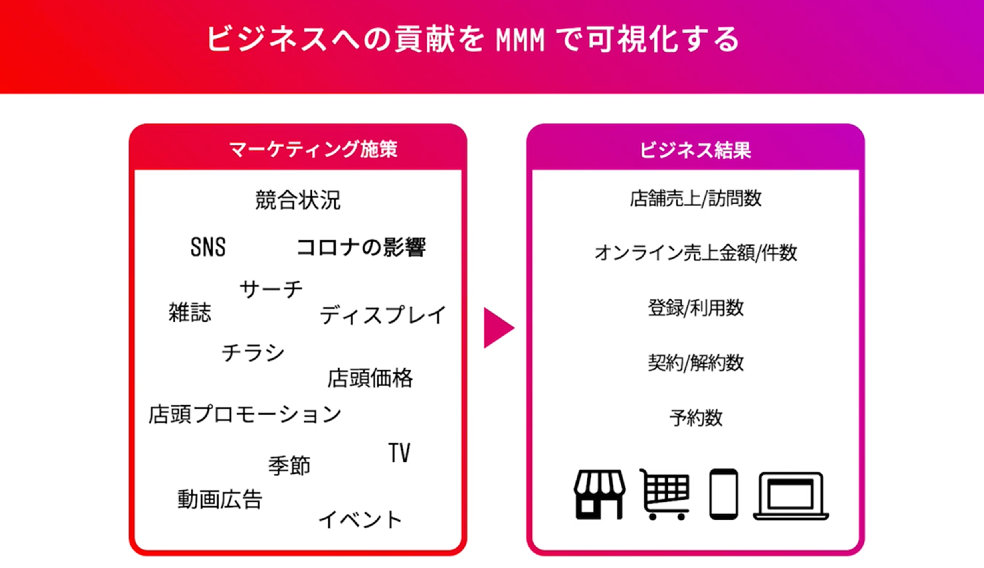 最後のステップ4では、今後のアクションに繋げるためのキャンペーンのビジネス貢献の可視化について説明。「単にキャンペーンに触れたテストグループの効果を測定するだけでなく、広告に接触しなかったコントロールグループとの差分を比較するリフト調査を実施することで、より正確に広告によってもたらされる純増効果を可視化することが可能です」と南氏。そのほか、マーケティング施策全般の効果を計測する方法として、独自のマーケティングミックスモデリング(MMM)を推奨した。
