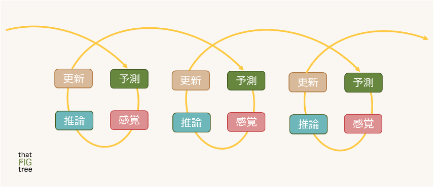 このようにして更新された内部モデルについて、新たな感覚入力との誤差が計算され、それを縮小するための知覚や行動がさらに起こる。このようにして、途切れることのない一連のループにより、刻々と変化する状況を知覚しながら、意思決定や行動を続け、結局トウモロコシを買ってかぶりついていた、と考えるといかがでしょうか。