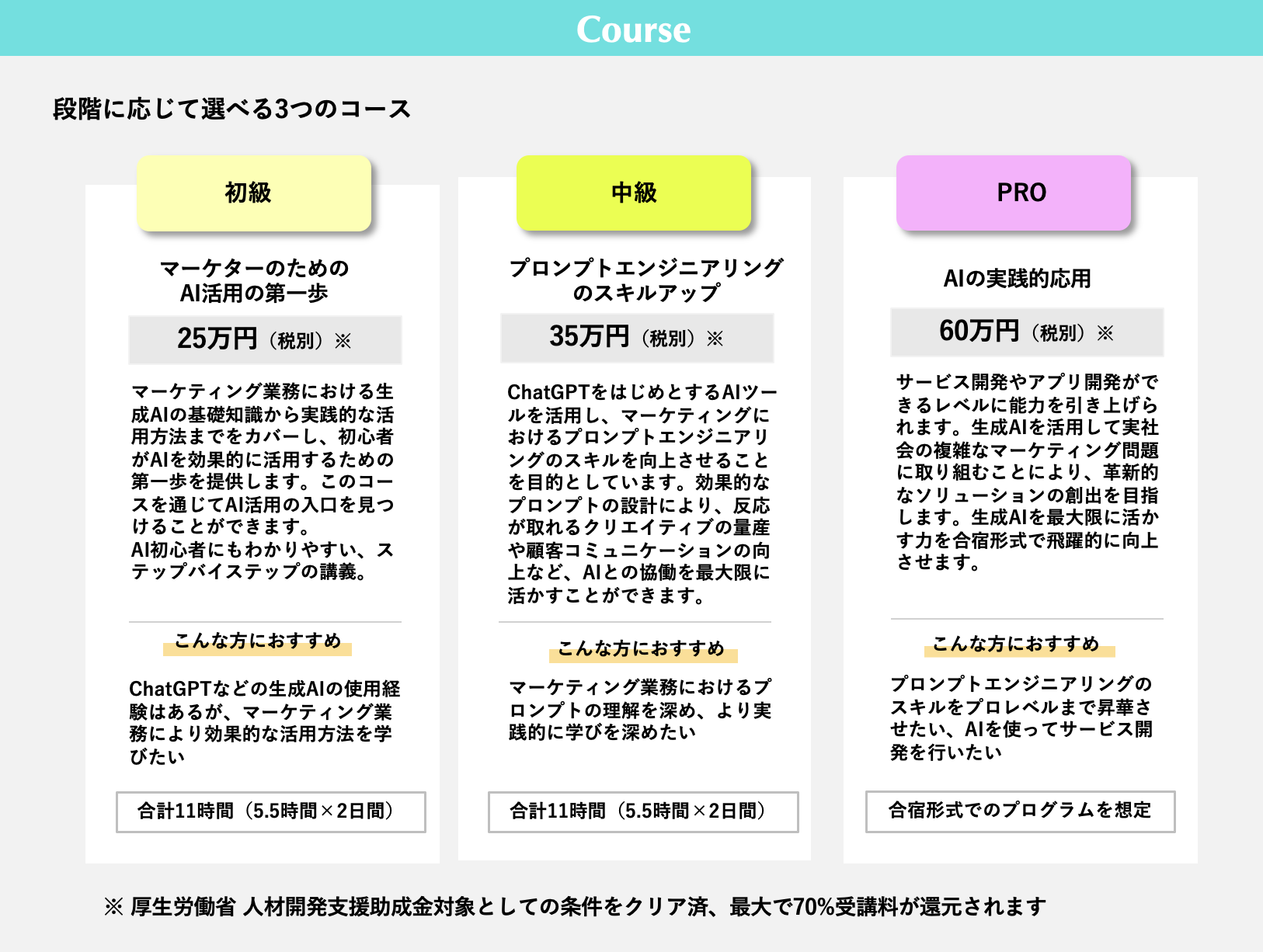 「AI UNIVERSITY For Marketers」はマーケティングの最前線で活躍するための実践的なプロンプトエンジニアリングスキルを習得できるスクール。グローバルスタンダートに基づいたカリキュラムで、生成AIを使いこなすプロのマーケターを目指す。各個人の生成AIに対する能力の段階に応じて3つの選べるコース(初級・中級・PRO)で実施する。本スクールは、厚生労働省の人材開発支援助成金を活用することで、受講料最大70%を還元でき、コストを抑えて受講できるプログラムとなっている。初回は、初級コースを2024年9月3日、10日の2日間で開催する。