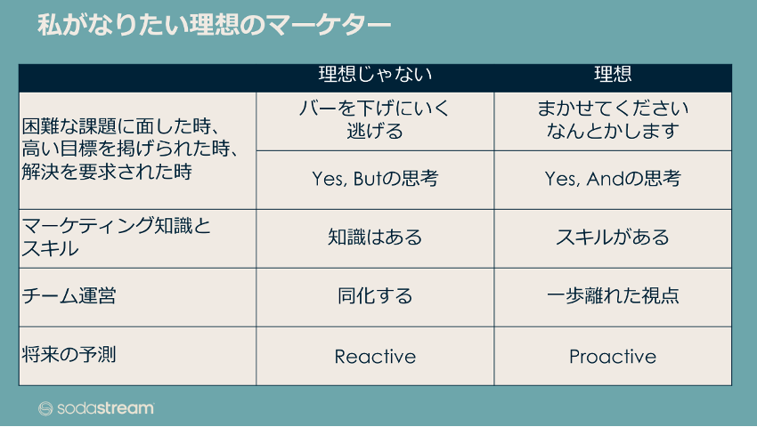 中村 まずは困難な課題に面した時というのは、先ほどのクマの例ですね。「バーを下げにいく、逃げる」は理想じゃないマーケター。一方で「まかせてください、なんとかします」は理想のマーケターですね。これはどういう意味ですか。