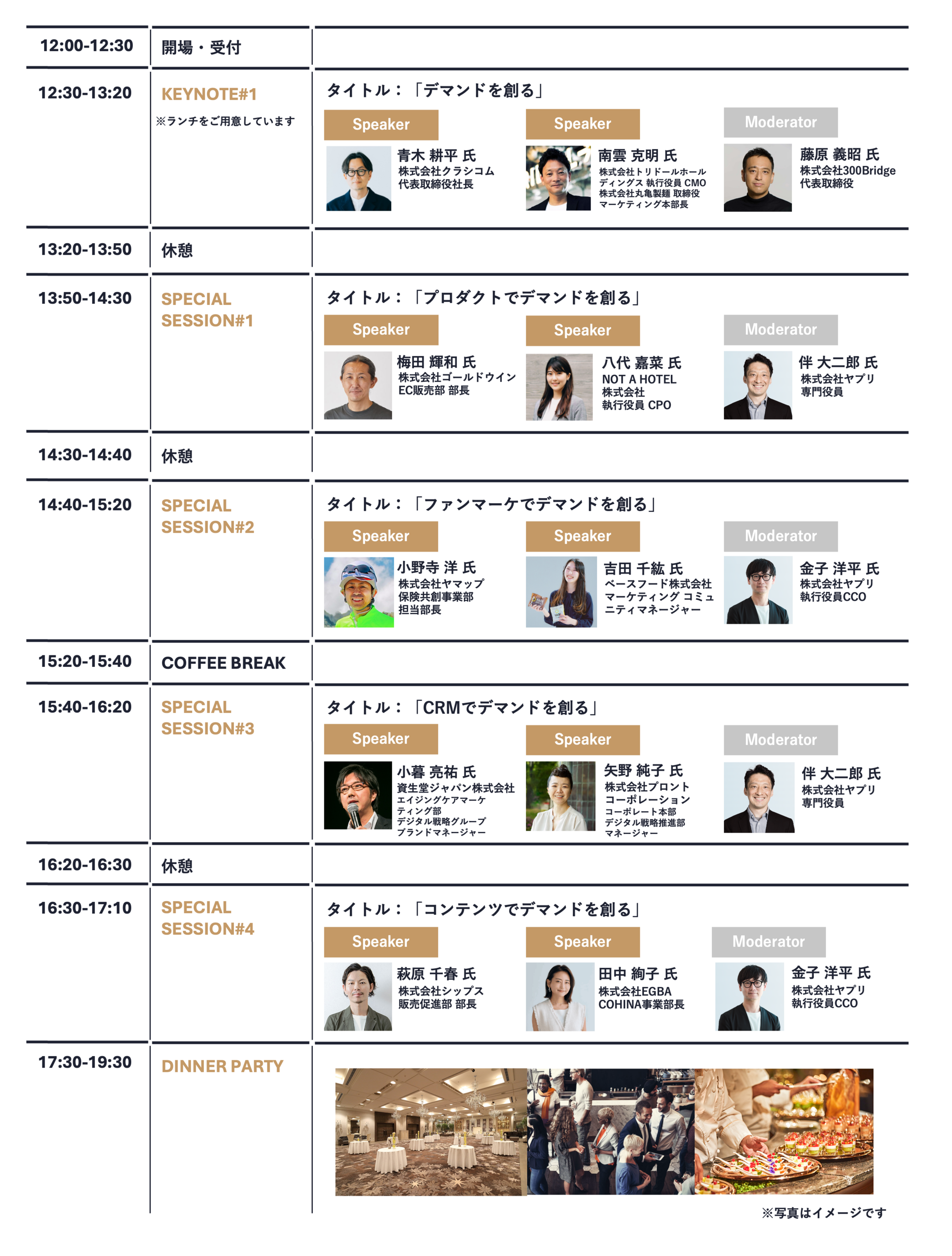 このほかプロダクト、ファンマーケティング、CRM、コンテンツなど、さまざまな角度からのデマンド創出に高い知見を持つマーケターが登壇し、最新の事例やノウハウ、思考法を共有する。