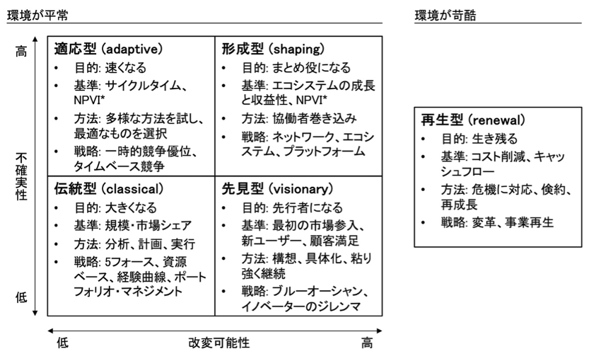 このうち環境が過酷な状況においては上記の図の右側にあるように「再生型」の一択ですが、それ以外の環境が平常な状況では不確実性と改変可能性それぞれの高低により「伝統型」「先見型」「形成型」「適応型」の4つの戦略スタイルがあるとされています。