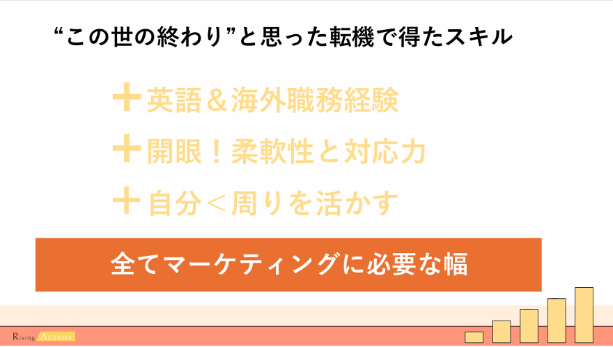 人生の終わりのように思えた経験でしたが、これら3つの転機を通じて、私のスキルの幅は確実に広がりました。現在は新たな転機として、ベンチャー企業でリカバリーウェア「BAKUNE」などを展開するTENTIALに参画し、新たな挑戦を始めています。ここでも、チームの強みを活かしマーケティングのパフォーマンスを最大化していきたいと考えています。