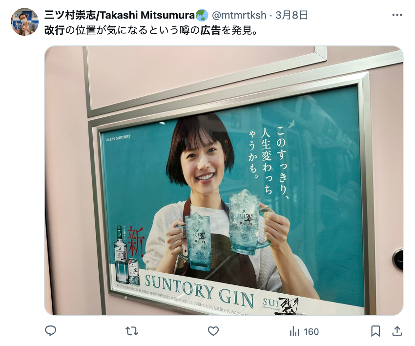 今回取り上げているサントリージン翠(SUI)のグラフィックは、「このすっきり、人生かわっちゃうかも。」という縦書きのコピーを、「このすっきり、」「人生かわっち」「ゃうかも。」という3行でレイアウトすることで、適切にメッセージを伝えながらも、充分に珍しい状況を実現し、ネットでの話題化に成功しました。