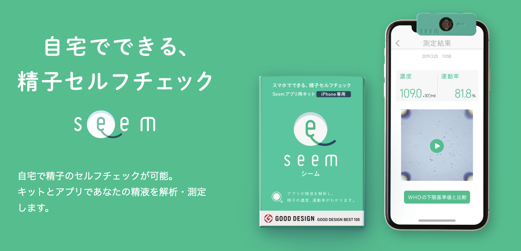 リクルートが提供する「Seem」は、専用キットとスマートフォンのアプリで精子の濃度と運動率を測定できるサービスです。使ってもらいたいのは、将来子どもが欲しいと思っている男性や現在妊活中の男性。「男性の妊活」という新しいマーケットをターゲットにしています。